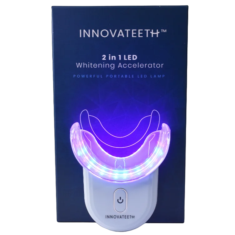 Der Innovateeth LED-Beschleuniger unterstützt nachweislich die Zahnaufhellung in Kombination mit Zahnaufhellungsstreifen und erhöht deren Wirksamkeit erheblich.