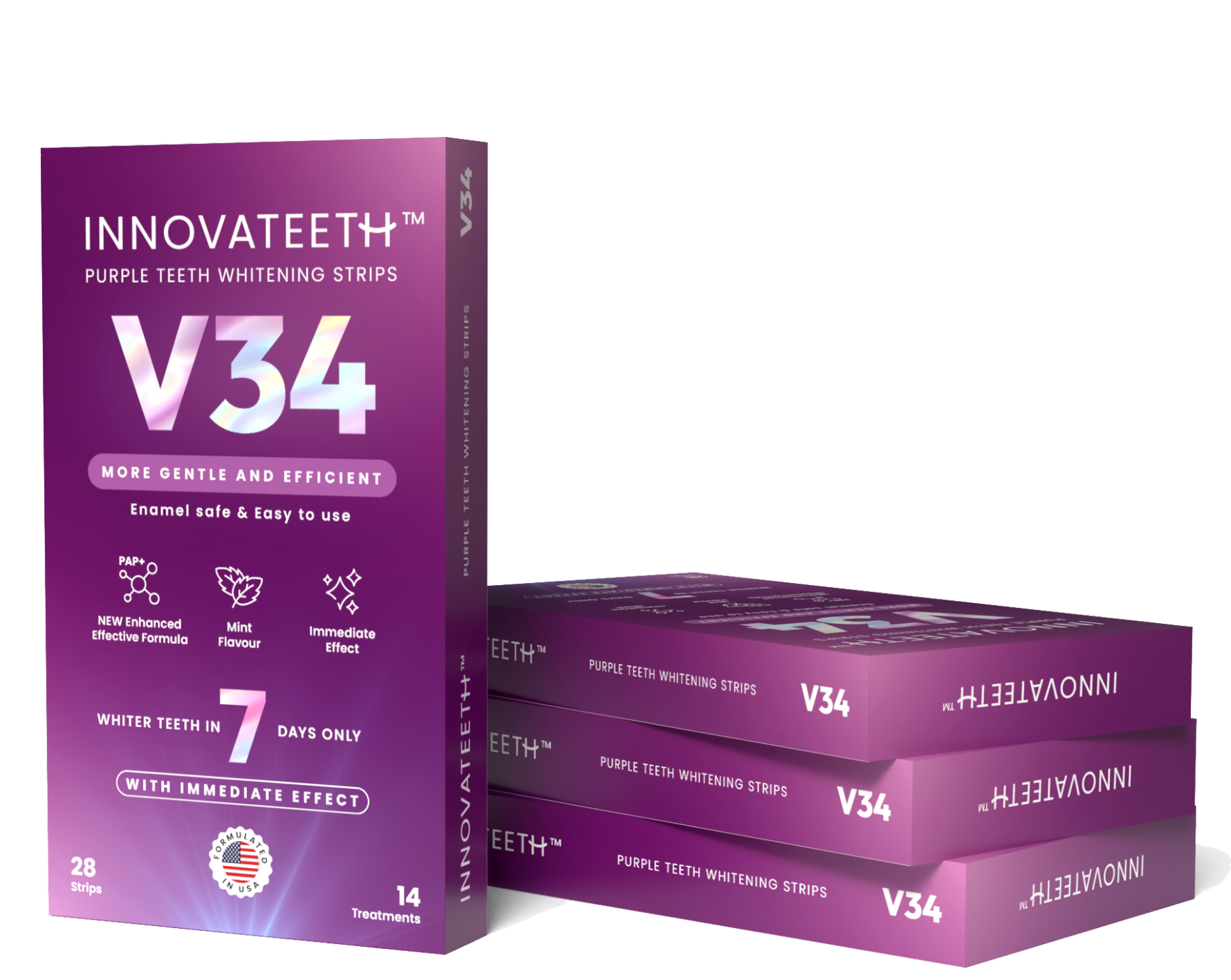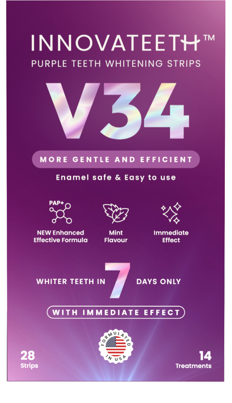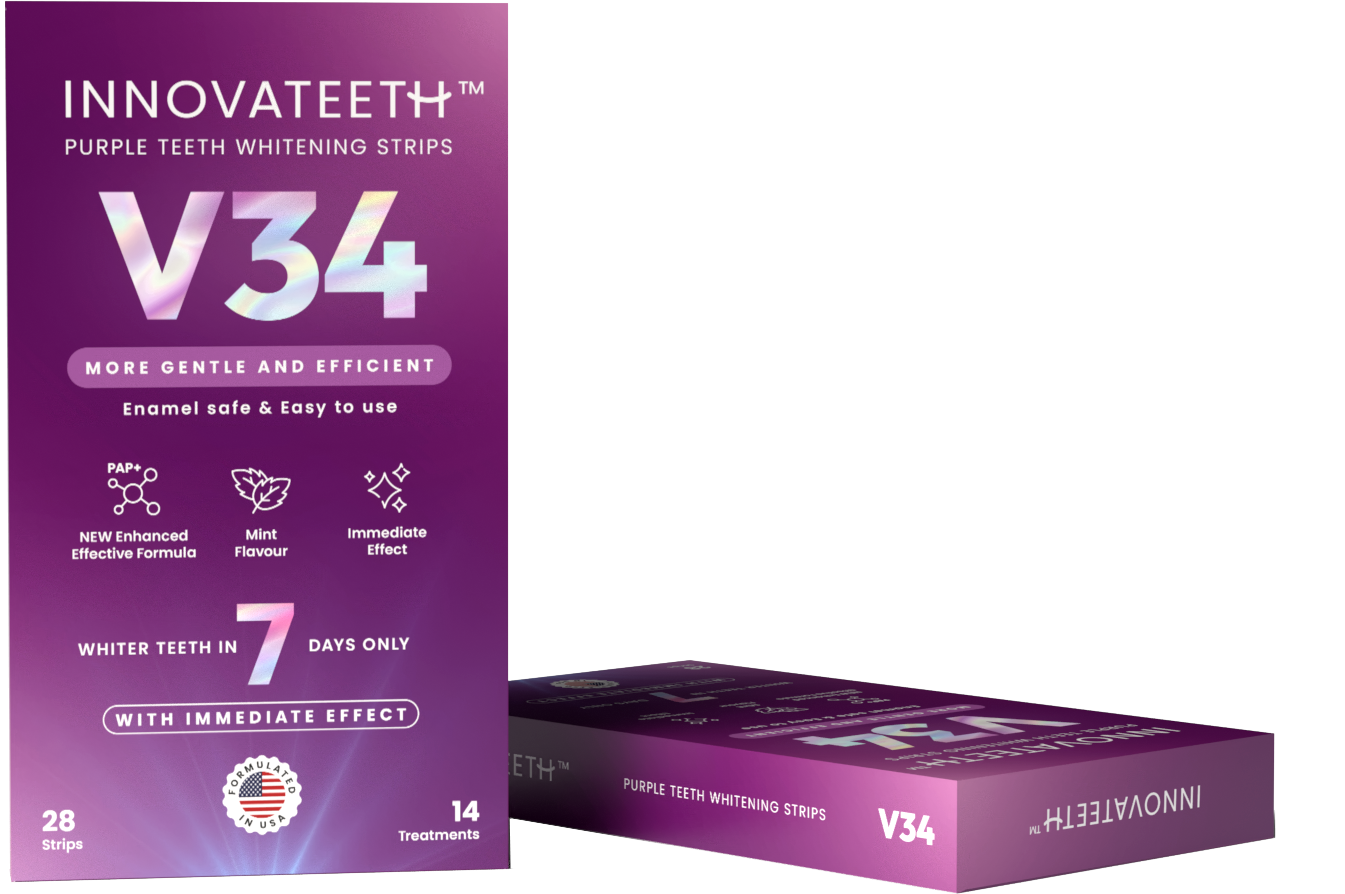INNOVATEETH V34 Zahnaufhellungsstreifen sind dank ihrer Zusammensetzung besonders wirksam . Gönnen Sie sich ein strahlendes Lächeln, das alle Blicke auf sich zieht!